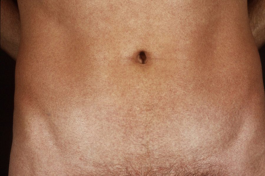 Roodvonk wordt veroorzaakt door een bacterie. Het begint vaak met keelpijn en koorts. Eerst wordt de tong wit en na een paar dagen rood en dik. Na drie dagen wordt de huid roze en ontstaan er ruwe, rode puntjes op de borst. Deze huiduitslag breidt zich geleidelijk uit over het hele lichaam.